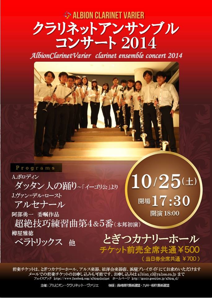 | >>2014/10/9 | クラリネットアンサンブルコンサート2014 アルビオン・クラリネット・ヴァリエ |