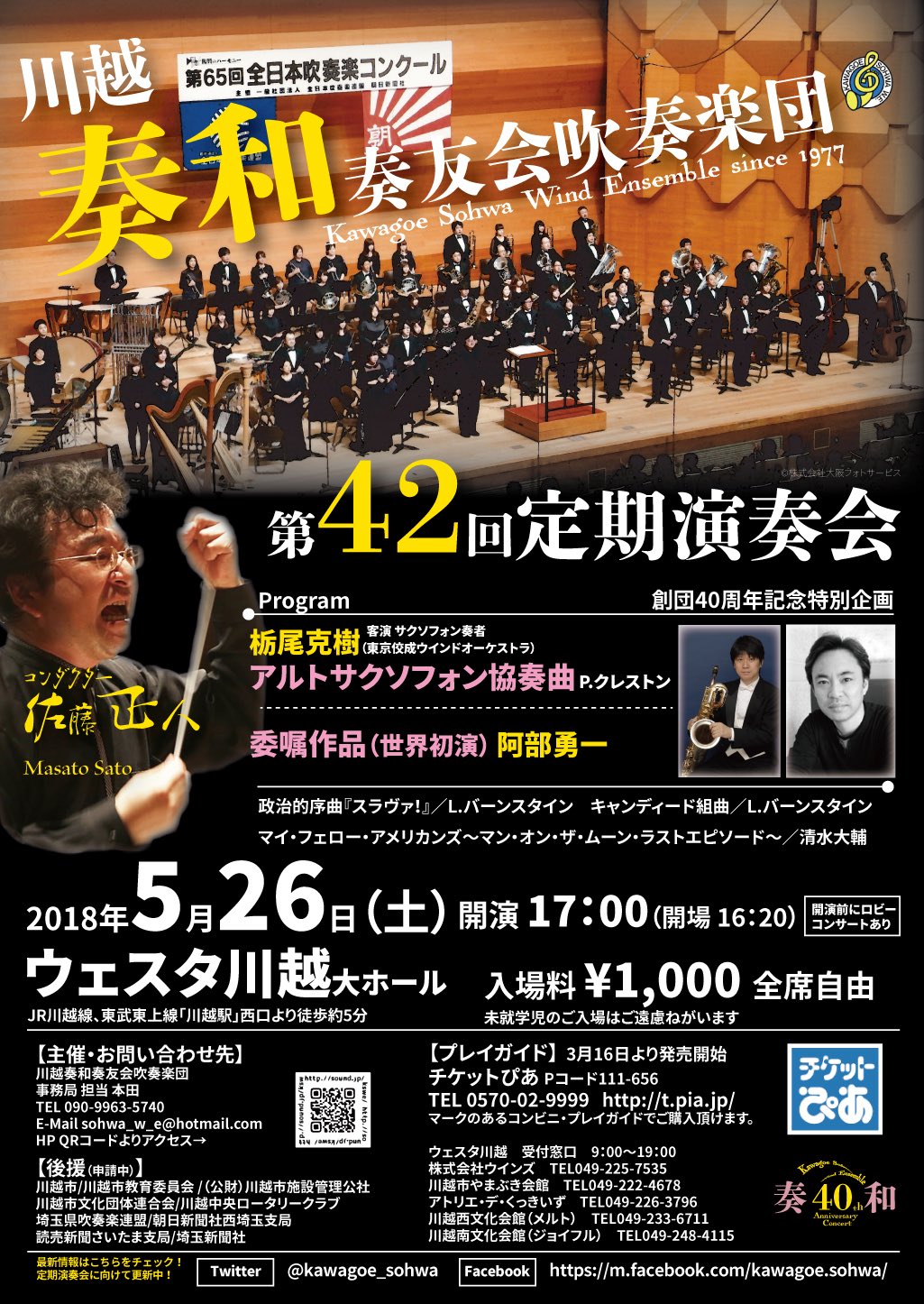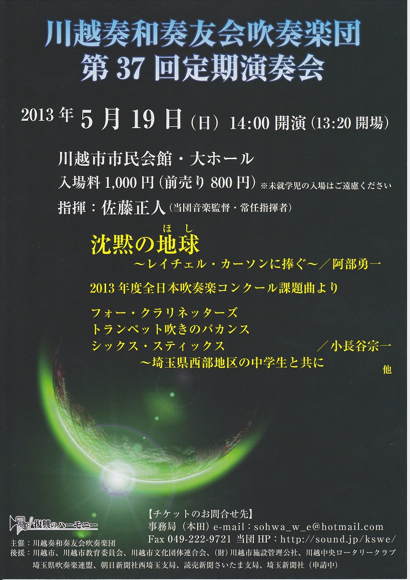 ■ 日時:2013/5/19(日) 川越奏和奏友会吹奏楽団 第37回定期演奏会 ■ 会場:川越市市民文化会館大ホール ■ 開場:13:20 (開演:14:00〜) 前売り800円(当日1,000円) ■ 演奏:川越奏和奏友会吹奏楽団 ■ 指揮:佐藤正人 |
