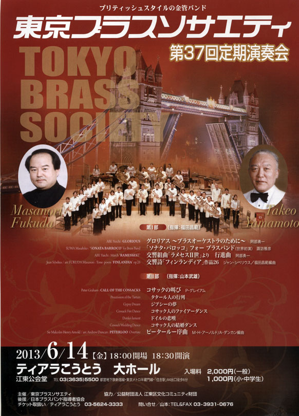 ・グロリアス 〜英国式ブラスバンド版〜 ・行進曲『ラメセス2世』 〜英国式ブラスバンド版〜 演奏して頂きます。 ◆東京ブラスソサエティ第37回定期演奏会|チラシ| ■ 日時:6/14(金) 18:30 一般2,000円 小・中学生1,000円 ■ 会場:ティアラこうとう大ホール ■ 演奏:東京ブラスソサエティ |